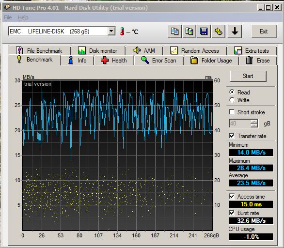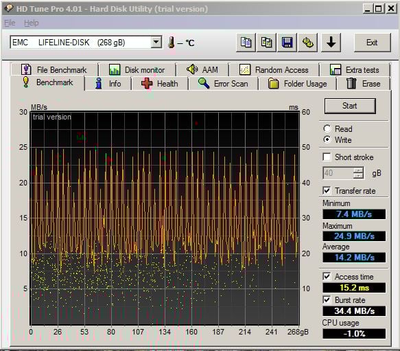 Performance is a little lacking. Don’t get me wrong, it is pretty snappy for a two drive SATA SAN, but I guess I’m already used to those damn SANs with 16 SAS drives LOL. I have posted screen shots of HD Tune Pro results below which will detail read and write performance.