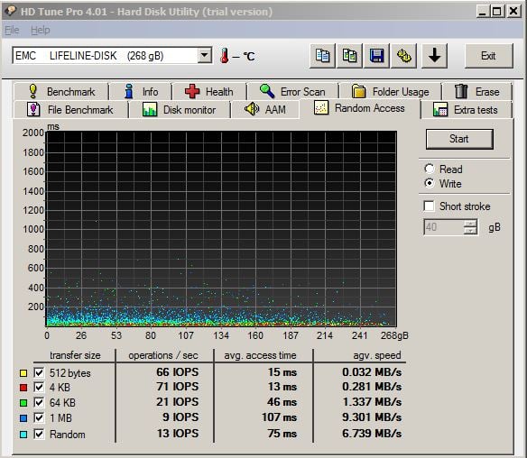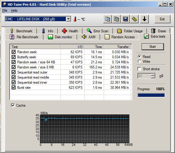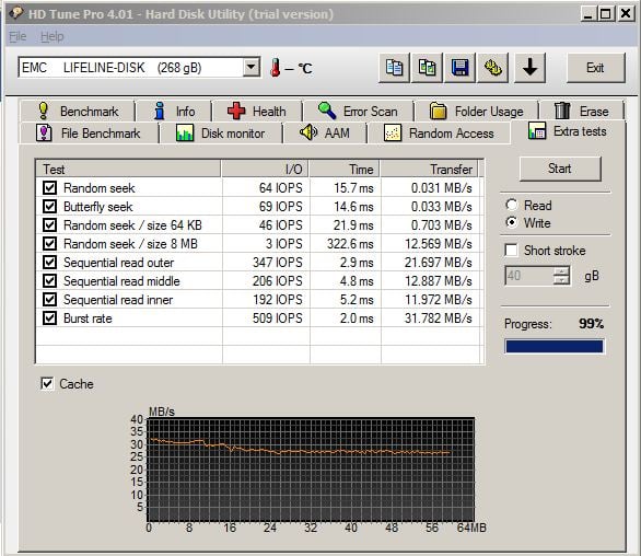 Images 1 – 6 are of the HD Tune Pro results. Image 7 is of a screenshot of how ESX see’s this things iSCSI shares… because of how it sees them I had no choice but to make the hostname of my IX2 “Celerra” 😉