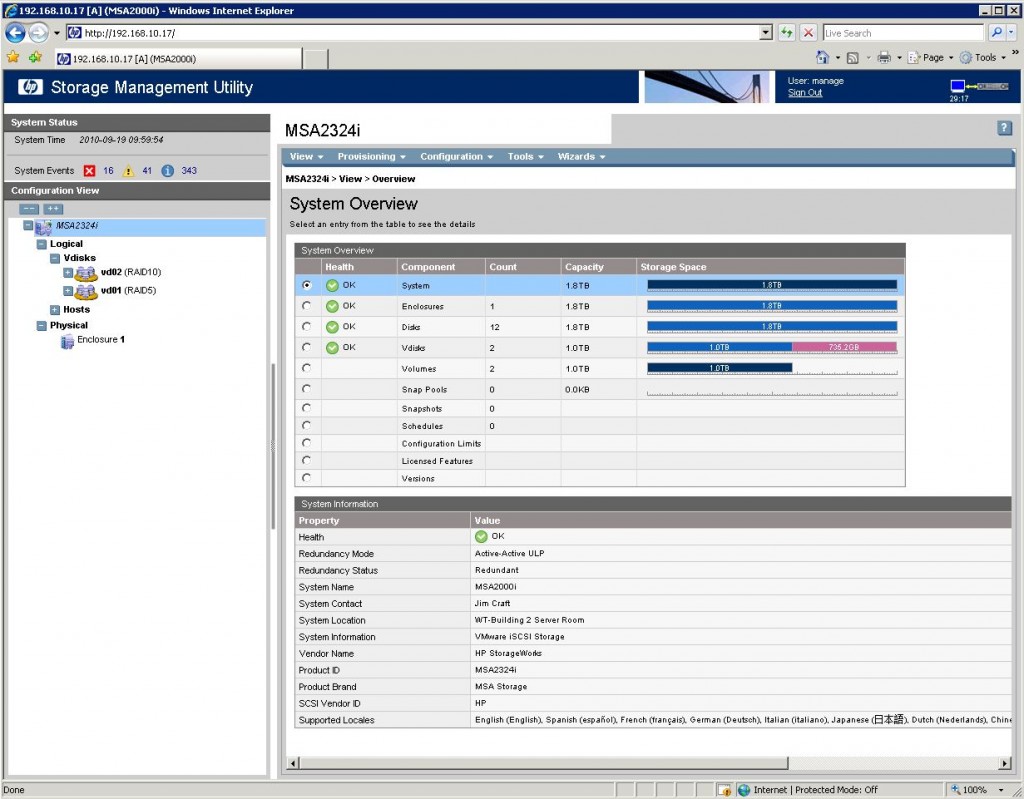 Thanks… My web management looks way different than yours.. I am bit confused how whoever set this up did it.. for example, we only have one ESX host and only one controller in the MSA. One of the iSCSI ports is going direct to ESX host.. where it get lost is the other iSCSI port is just going back to a network switch for whatever reason.. also, like I said the MSA only has one controller and two RAID5 volumes.. what is weird is the second RAID5 volume shows being on “RAID Controller B” which I assume refers to the secondary slot but that is currently empty.. lol