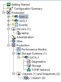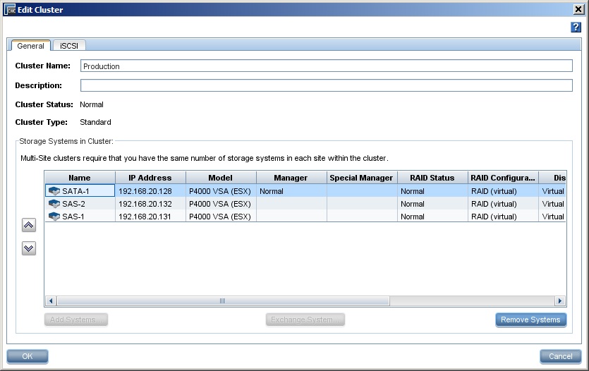 As you can also see in this screenshot besides the Restriping status is the list of Storage Systems on the left. We can now see that we are using SAS-1 and SAS-2 for this cluster. and the SATA-1 node which was the only node in our cluster is now in the management group … but not listed as an available system (at least yet). After ALL volumes and snapshots are restriped we can safely shutdown the old node.