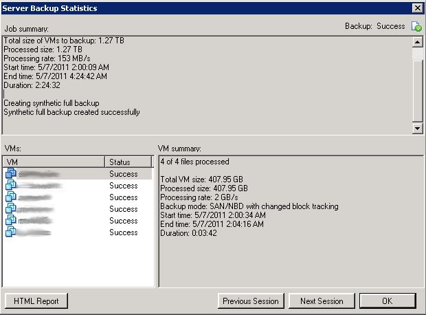 Customer B (with the SMSproSafe) has 1.27TB of VM space in the backup job, and it takes about 2.5 hours. But look at the processing rate… 153MB/s, almost 3x faster.