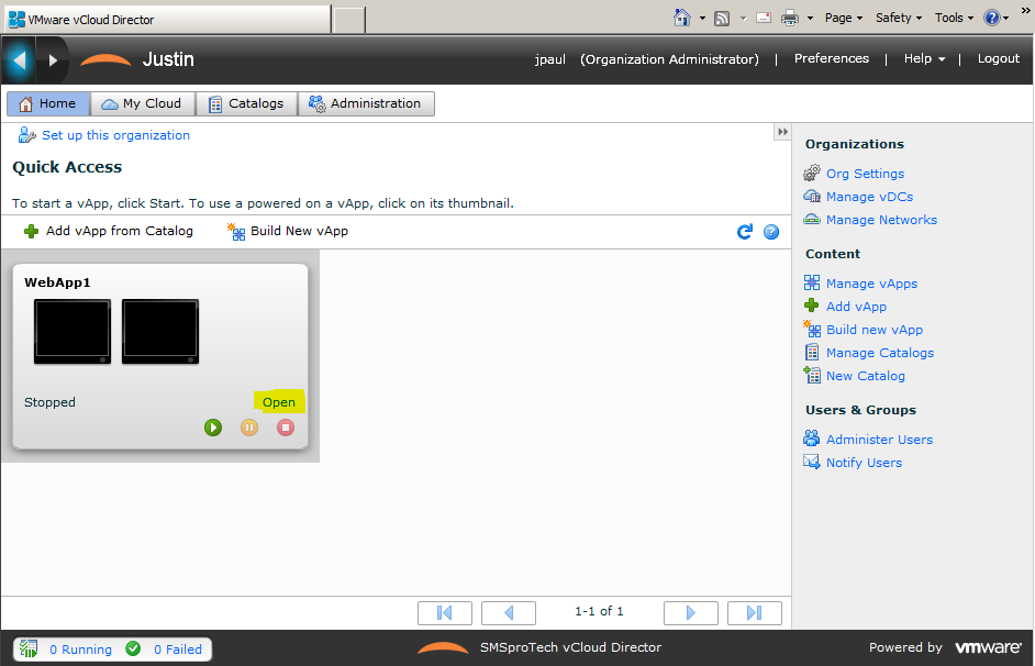 An external network in “vCloud speak”is a virtual network that has access to devices outside of the vCloud. This could be the internet (which is the case in this example) or it could just be the company LAN. After setting all of the VM’s networks click Next to see a summary page, or just click Finish to provision your new virtual machines. After clicking Finish you will be returned to the home screen where you should now see your new vApp. You can click the “Open” link to drill down into it and see the individual VM’s.