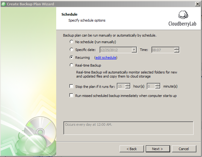 Cloudberry offers several backup products for almost any situation, from a single laptop to a Microsoft Small Business Server to your standard Windows server… they do it all. From what I have seen they have built in VSS support if you want to use it, but for my use case I left it off as I just wanted to push my documents and pictures to the cloud.