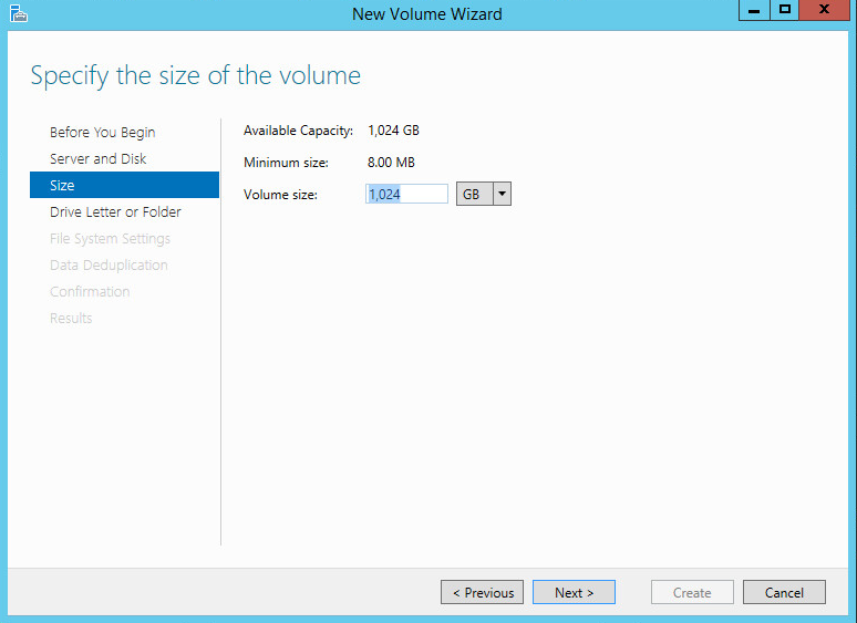 The next page will allow you to set a size of the new volume. Unless you have a good reason not to, set the size to the maximum available.